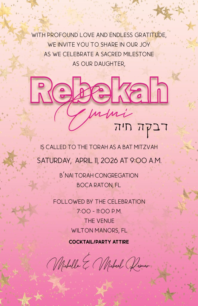 The Main Event – Rebekah’s Bat Mitzvah Service will begin promptly at 9:00 a.m. in the main sanctuary followed by a Kiddush Lunch in the Great Hall at B’nai Torah Congregation located at 6261 SW 18th Street, Boca Raton, FL.